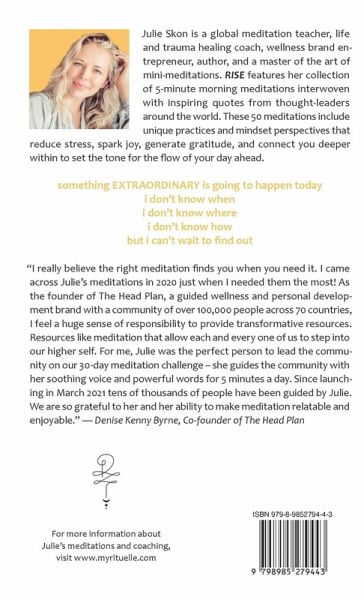 RISE: mini mindful morning meditations is a collection of fifty 5-minute morning meditations created by global meditation teacher, Julie Skon. Tangible for busy people, these mini meditations transform the morning from feeling stressed and disconnected, to allowing the reader to set the tone for their day ahead with mindful meditation that reduces stress, calms the mind, is healing for the body, and connects the reader deeper within and with the world around them. In just a few minutes of mindful meditation daily, readers of RISE will create a powerful foundation of a morning meditation practice through experiencing a range of meditation styles interwoven with impactful quotes from thought-leaders around the world. The meditations of RISE include ancient and new practices, mindful breathing, self-reflection, releasing and letting go, manifestation, gratitude, abundance creation, and much more. When readers dive in they will experience the power of taking just a few moments for mindfulness daily as they create ripple effects of connection, calmness, happiness, and presence. Author, Julie Skon is a multi-modality healing practitioner, a meditation teacher featured on Insight Timer and The Head Plan, life and trauma healing coach, a wellness brand entrepreneur and writer. Julie is wildly passionate about finding solutions in our busy lives to reduce stress, to connect us deeper within and with the world around us, to heal our minds and bodies, and to get mindfully present within the special moments of our day. RISE is Julie's personal written collection of her favorite fifty morning mini meditations. Examples of Mini Morning Meditation Titles and Quotes included in RISE:Little Things "The little things? The little moments? They aren't little." - Jon Kabat-Zin This meditation calms our minds and bodies through mindful breathing and creates gratitude by bringing awareness to the little things that we are thankful for. Zen in Ten "For fast acting relief, try slowing down." - Lily Tomlin Through embodiment of ten calming words, this meditation allows us to embrace the feelings of each. Morning Metta "You can search throughout the entire universe for someone who is more deserving of your love and affection than you are yourself, and that person is not to be found anywhere. You, yourself, as much as anybody in the entire universe, deserve your love and affection."- Sharon Salzberg This meditation cultivates love and kindness for yourself, another, and the entire Universe.
