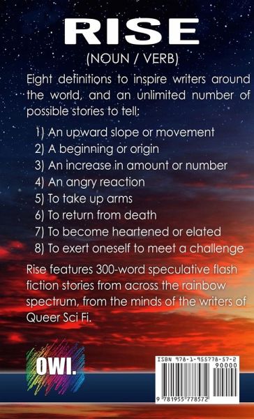 RISE (noun / verb) Eight definitions to inspire writers around the world, and an unlimited number of possible stories to tell: 1) An upward slope or movement 2) A beginning or origin 3) An increase in amount or number 4) An angry reaction 5) To take up arms 6) To return from death 7) To become heartened or elated 8) To exert oneself to meet a challenge Rise features 300-word speculative flash fiction stories from across the rainbow spectrum, from the minds of the writers of Queer Sci Fi.
