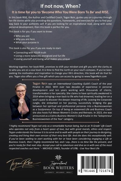 If not now, When? It is time for you to 'Become Who You Were Born To Be' and RISE. In this book RISE, the Author and Certified Coach, Tegan Rein, guides you on a journey through her life stories while also providing the questions, frameworks, and exercises for you to find your way back to your authentic self. If you are looking for an inspirational read, along with some personal development, then this book is perfect for you. This book is for you if you want to know: ¿ Who you are ¿ Why you are here ¿ What your purpose is This book is also for you if you are ready to start: ¿ Connecting with YOUR truth ¿ Living a more balanced, energised and fun life ¿ Loving yourself and loving what makes you unique Working together, her book RISE, promises to shift your mindset and gift you with the clarity as to who you are on a soul level. It is time to find the north on your soul's compass. If you've been seeking the motivation and inspiration to change your life's direction, this book will do that for you. Tegan also offers you a free gift which you can access by going to www.TeganRein.com Tegan Rein was an International Coaching Guild's Coach of the year Finalist in 2022. With over two decades of experience in personal development and ten years working with thousands of clients, transformation is her specialty. She claims to have spiritually awakened in 2014 when bringing a man back to life who had drowned, leading her on a soul's quest to discover the deeper meaning of life. Leaving the Corporate Jungle, she embarked on her journey, successfully bridging the gap between her spiritual and professional personas into a Businesswoman as a Soulpreneur. On top of being an esteemed Life and Business Coach she also hosts Full Moon Women's Circles and Retreats. In 2023, she was announced as a Cairns Business Women's Club Finalist in the 'Solopreneur Businesswomen of the Year' category.
