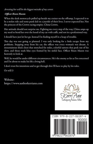 Arresting her will be the biggest mistake of my career. -Officer Risen Mason When the sleek motorcycle pulled up beside my cruiser on the offramp, I expected it to be a stolen ride and some punk kid on a joyride of their lives. I never expected her. Not the princess of the Crown racing empire. China Crown. Her attitude should not surprise me. Fighting me every step of the way, China amps up my need to bend her over the hood of my car with cuffs, and not in a professional way. I should have just let her go. Instead I'm finding myself in a heap of trouble. This day was not going as planned. I was only looking for a little escape from my problems. Stepping away from his car, the officer was every woman's wet dream. A mountainous thick chest that stretched for miles, colorful tattoos that peek out of his shirt, and those stark blue eyes framed by his sinful face. Officer Risen Mason was heavenly to look at. Well, he would be under different circumstances. He's the enemy as far as I'm concerned and I'm about to make his life a living hell. I don't trust his intentions and to get through this I'll have to play by his rules. Or will I?