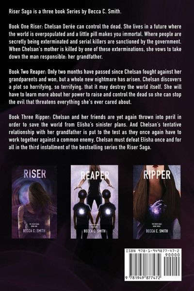 Riser Saga is a three book Series by Becca C. Smith. Book One Riser: Chelsan Derée can control the dead. She lives in a future where the world is overpopulated and a little pill makes you immortal. Where people are secretly being exterminated and serial killers are sanctioned by the government. When Chelsan's mother is killed by one of these exterminations, she vows to take down the man responsible: her grandfather. Book Two Reaper: Only two months have passed since Chelsan fought against her grandparents and won, but a whole new nightmare has arisen. Chelsan discovers a plot so horrifying, so terrifying, that it may destroy the world itself. She will have to learn more about her power to raise and control the dead so she can stop the evil that threatens everything she's ever cared about. Book Three Ripper: Chelsan and her friends are yet again thrown into peril in order to save the world from Elisha's sinister plans. And Chelsan's tentative relationship with her grandfather is put to the test as they once again have to work together against a common enemy. Chelsan must defeat Elisha once and for all in the third installment of the bestselling series the Riser Saga.