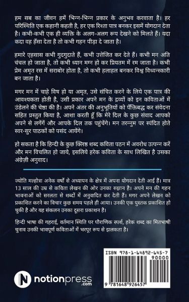 Our life makes us go through various kinds of experiences. Every situation narrates a tale and each relationship becomes a character in the story and makes its own contribution. Sometimes we see different characteristics of the same person. At times, he makes us laugh and at other moments, he causes immense pain. These subtle feelings tickle us sometimes and anguish us at others. The heart becomes restless during some moments and at others, gets completely absorbed in the thoughts of the beloved. At times, it gets drenched in the ambrosia of love and at others, it gets converted into the deadly poison 'Halahal' that has the ability to destroy the entire universe. Whether it is nectar or poison, both of them require a vessel to contain them. In the same way, I have attempted to pour the liquids inside my heart into the containers of my poems. I have made an attempt to translate my innermost sensations into words and presented them for you. I hope that these dialogues of my heart will touch your heart and you will relate to them like your own personal experiences. Maybe, the readers find some Hindi words to be difficult to understand. And that might create a break in relishing the poems. Keeping that in mind, an English narrative has been provided along with every couplet.