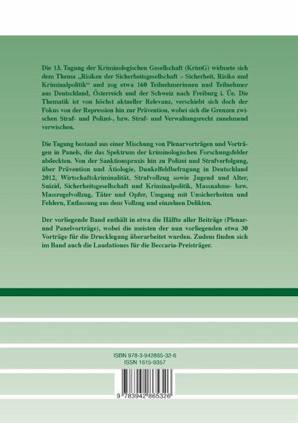 Die 13. Tagung der Kriminologischen Gesellschaft (KrimG) widmete sich dem Thema ¿Risiken der Sicherheitsgesellschaft ¿ Sicherheit, Risiko und Kriminalpolitik¿ und zog etwa 160 Teilneh-merinnen und Teilnehmer aus Deutschland, Österreich und der Schweiz nach Freiburg i. Üe. Die Thematik ist von höchst aktueller Relevanz, verschiebt sich doch der Fokus von der Repression hin zur Prävention, wobei sich die Grenzen zwischen Straf- und Polizei-, bzw. Straf- und Verwaltungsrecht zunehmend verwischen. Die Tagung bestand aus einer Mischung von Plenarvorträgen und Vorträgen in Panels, die das Spektrum der kriminologischen Forschungsfelder abdeckten. Von der Sanktionspraxis hin zu Polizei und Strafverfolgung, über Prävention und Ätiologie, Dunkelfeldbefragung in Deutschland 2012, Wirtschaftskriminalität, Strafvollzug sowie Jugend und Alter, Suizid, Sicherheitsgesellschaft und Kriminalpolitik, Massnahme- bzw. Massregelvollzug, Täter und Opfer, Umgang mit Unsicherheiten und Fehlern, Entlassung aus dem Vollzug und einzelnen Delikten. Der vorliegende Band enthält in etwa die Hälfte aller Beiträge (Plenar- und Panelvorträge), wobei die meisten der nun vorliegenden etwa 30 Vorträge für die Drucklegung überarbeitet wurden. Zudem finden sich im Band auch die Laudationes für die Beccaria-Preisträger.