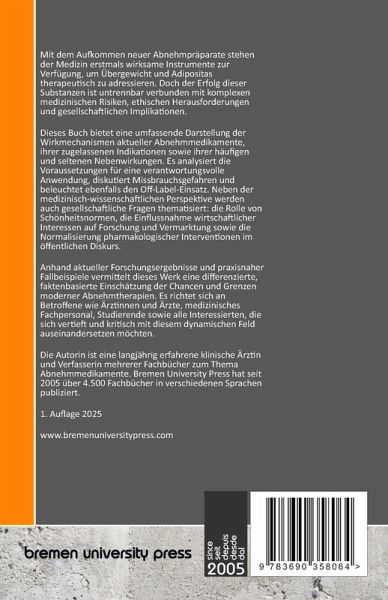 Mit dem Aufkommen neuer Abnehmpräparate stehen der Medizin erstmals wirksame Instrumente zur Verfügung, um Übergewicht und Adipositas therapeutisch zu adressieren. Doch der Erfolg dieser Substanzen ist untrennbar verbunden mit komplexen medizinischen Risiken, ethischen Herausforderungen und gesellschaftlichen Implikationen. Dieses Buch bietet eine umfassende Darstellung der Wirkmechanismen aktueller Abnehmmedikamente, ihrer zugelassenen Indikationen sowie ihrer häufigen und seltenen Nebenwirkungen. Es analysiert die Voraussetzungen für eine verantwortungsvolle Anwendung, diskutiert Missbrauchsgefahren und beleuchtet ebenfalls den Off-Label-Einsatz. Neben der medizinisch-wissenschaftlichen Perspektive werden auch gesellschaftliche Fragen thematisiert: die Rolle von Schönheitsnormen, die Einflussnahme wirtschaftlicher Interessen auf Forschung und Vermarktung sowie die Normalisierung pharmakologischer Interventionen im öffentlichen Diskurs. Anhand aktueller Forschungsergebnisse und praxisnaher Fallbeispiele vermittelt dieses Werk eine differenzierte, faktenbasierte Einschätzung der Chancen und Grenzen moderner Abnehmtherapien. Es richtet sich an Betroffene wie Ärztinnen und Ärzte, medizinisches Fachpersonal, Studierende sowie alle Interessierten, die sich vertieft und kritisch mit diesem dynamischen Feld auseinandersetzen möchten. Die Autorin ist eine langjährig erfahrene klinische Ärztin und Verfasserin mehrerer Fachbücher zum Thema Abnehmmedikamente. Bremen University Press hat seit 2005 über 4.500 Fachbücher in verschiedenen Sprachen publiziert. 1. Auflage 2025