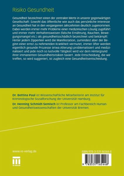 Henning Schmidt-Semisch/Bettina Paul Gesundheit bezeichnet einen der zentralen Werte in unserer gegenwärtigen - sellschaft: Sowohl das öffentliche wie auch das persönliche Interesse an - sundheit hat in den vergangenen Jahrzehnten deutlich zugenommen. Aber auch wenn (zumindest in den westlichen Industriestaaten) die durchschnittliche - benserwartung seit Ende des 19. Jahrhunderts enorm angestiegen ist und das System der gesundheitlichen Versorgung sich deutlich verbessert hat, so heißt dies doch nicht, dass das Leben heutzutage (zumindest subjektiv) weniger riskant und die Gesundheit weniger gefährdet wäre. Im Gegenteil kann man mit Bezug auf Luhmann (1991, 1993) sagen, dass es mit der Mehrung des medizinischen und epidemiologischen Wissens sowie entsprechender Informationen auch zu einer Ausweitung der Entscheidungsmöglichkeiten und -notwendigkeiten kommt - und damit zugleich zu einem Mehr an Risiken, sich in gesundheitlicher H- sicht richtig oder falsch zu entscheiden. Diese Entwicklung wird zugleich aber noch dadurch gefördert, dass immer mehr Probleme einer medizinischen Lösung zugeführt und immer mehr Verhaltensweisen als gesundheitsschädlich bezei- net und bekämpft werden: Hinter jedem Zipperlein wird die Manifestation, - mindest aber der Beginn einer ernstzunehmenden Krankheit vermutet, immer öfter werden eigentlich gesunde Prozesse (etwa Alterung oder Menopause) pr- lematisiert und medizinalisiert und jede noch so lustvolle Tätigkeit wird vor dem Hintergrund ihrer immanenten Gesundheitsrisiken taxiert. Jede Entscheidung, die wir treffen, so wird suggeriert, ist zugleich eine Entscheidung über unsere Gesundheit.