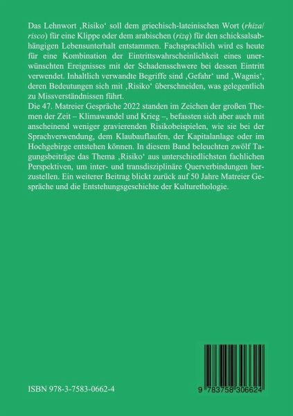 Das Lehnwort "Risiko" soll dem griechisch-lateinischen Wort (rhiza/risco) für eine Klippe oder dem arabischen (rizq) für den schicksalsabhängigen Lebensunterhalt entstammen. Fachsprachlich wird es heute für eine Kombination der Eintrittswahrscheinlichkeit eines unerwünschten Ereignisses mit der Schadensschwere bei dessen Eintritt verwendet. Inhaltlich verwandte Begriffe sind "Gefahr" und "Wagnis", deren Bedeutungen sich mit "Risiko" überschneiden, was gelegentlich zu Missverständnissen führt.Die 47. Matreier Gespräche 2022 standen im Zeichen der großen Themen der Zeit - Klimawandel und Krieg -, befassten sich aber auch mit anscheinend weniger gravierenden Risikobeispielen, wie sie bei der Sprachverwendung, dem Klaubauflaufen, der Kapitalanlage oder im Hochgebirge entstehen können. In diesem Band beleuchten zwölf Tagungsbeiträge das Thema "Risiko" aus unterschiedlichsten fachlichen Perspektiven, um inter- und transdisziplinäre Querverbindungen herzustellen. Ein weiterer Beitrag blickt zurück auf 50 Jahre Matreier Gespräche und die Entstehungsgeschichte der Kulturethologie.