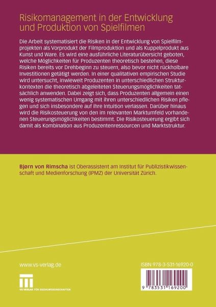 Die Arbeit systematisiert die Risiken in der Entwicklung von Spielfilmprojekten als Vorprodukt der Filmproduktion und als Kuppelprodukt aus Kunst und Ware. Es wird eine ausführliche Literaturübersicht geboten, welche Möglichkeiten für Produzenten theoretisch bestehen, diese Risiken bereits vor Drehbeginn zu steuern, also bevor nicht rückholbare Investitionen getätigt werden. In einer qualitativen empirischen Studie wird untersucht, inwieweit Produzenten in unterschiedlichen Strukturkontexten die theoretisch abgeleiteten Steuerungsmöglichkeiten tatsächlich anwenden. Dabei zeigt sich, dass Produzenten allgemein einen wenig systematischen Umgang mit ihren unterschiedlichen Risiken pflegen und sich insbesondere auf ihre Intuition verlassen. Darüber hinaus wird die Risikosteuerung von den im relevanten Marktumfeld vorhandenen Steuerungsmöglichkeiten bestimmt. Die Risikosteuerung ergibt sich damit als Kombination aus Produzentenressourcen und Marktstruktur.