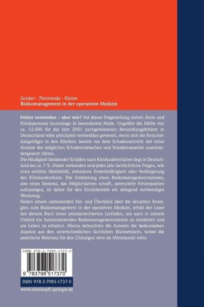 Begriffserklärung Risiko.- Was bedeutet Risikomanagement?.- Warum Risikomanagement im Krankenhaus?.- Von Anderen lernen.- Rechtliche Rahmenbedingungen.- Verhaltensweise bei Patientenvorwürfen.- Risikomanagement aus Sicht des Patienten.- Ökonomische Betrachtungen zum Risikomanagement im Krankenhaus.- Risikomanagement im IT-Bereich.- Risikomanagement aus Sicht der Versicherungen.- Risikomanagement aus Sicht der Pflegedirektion.- Risikomanagement und Hygiene.- Bestandteile eines Risikomanagements.- Erhöhung der Patientensicherheit durch effektive Incident-Reporting-Systeme am Beispiel von PaSIS.- Einsatzbereiche und Grenzen des klinischen Risikomanagements.- Risikomanagement oder Qualitätsmanagement?.- Klinisches Risikomanagement in der Praxis.- Berichtssysteme in anderen Ländern - ein Blick über den Tellerrand.