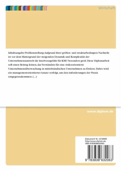 Aufgrund ihrer größen- und strukturbedingten Nachteile ist vor dem Hintergrund der steigenden Dynamik und Komplexität der Unternehmensumwelt die Insolvenzgefahr für KMU besonders groß. Diese Diplomarbeit soll einen Beitrag leisten, das Verständnis für eine risikoorientierte Unternehmensüberwachung in mittelständischen Unternehmen zu fördern. Dabei wird ein managementorientierter Ansatz verfolgt, um den Anforderungen der Praxis entgegenzukommen.