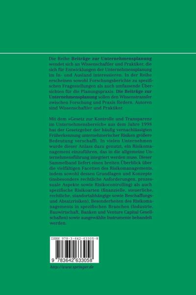 Mit dem "Gesetz zur Kontrolle und Transparenz im Unternehmensbereich" aus dem Jahre 1998 hat der Gesetzgeber der häufig vernachlässigten Früherkennung unternehmerischer Risiken größere Bedeutung verschafft. In vielen Unternehmen wurde dieser Anlass dazu genutzt, ein Risikomanagement einzuführen, das in die allgemeine Unternehmensführung integriert werden muss. Dieser Sammelband liefert einen breiten Überblick über die vielfältigen Facetten des Risikomanagements, indem sowohl dessen Grundlagen und Konzepte (insbesondere rechtliche Anforderungen, prozessuale Aspekte sowie Risikocontrolling) als auch spezifische Risikoarten (finanzielle, steuerliche, rechtliche, standortabhängige sowie Beschaffungs- und Absatzrisiken), Besonderheiten des Risikomanagements in spezifischen Branchen (Industrie, Bauwirtschaft, Banken und Venture Capital Gesellschaften) sowie ausgewählte Instrumente behandelt werden.