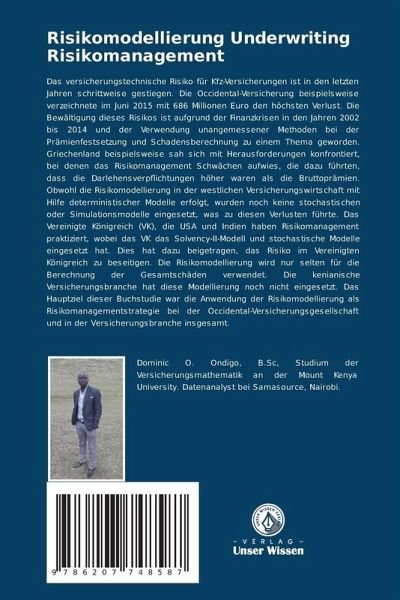 Das versicherungstechnische Risiko für Kfz-Versicherungen ist in den letzten Jahren schrittweise gestiegen. Die Occidental-Versicherung beispielsweise verzeichnete im Juni 2015 mit 686 Millionen Euro den höchsten Verlust. Die Bewältigung dieses Risikos ist aufgrund der Finanzkrisen in den Jahren 2002 bis 2014 und der Verwendung unangemessener Methoden bei der Prämienfestsetzung und Schadensberechnung zu einem Thema geworden. Griechenland beispielsweise sah sich mit Herausforderungen konfrontiert, bei denen das Risikomanagement Schwächen aufwies, die dazu führten, dass die Darlehensverpflichtungen höher waren als die Bruttoprämien. Obwohl die Risikomodellierung in der westlichen Versicherungswirtschaft mit Hilfe deterministischer Modelle erfolgt, wurden noch keine stochastischen oder Simulationsmodelle eingesetzt, was zu diesen Verlusten führte. Das Vereinigte Königreich (VK), die USA und Indien haben Risikomanagement praktiziert, wobei das VK das Solvency-II-Modell und stochastische Modelle eingesetzt hat. Dies hat dazu beigetragen, das Risiko im Vereinigten Königreich zu beseitigen. Die Risikomodellierung wird nur selten für die Berechnung der Gesamtschäden verwendet. Die kenianische Versicherungsbranche hat diese Modellierung noch nicht eingesetzt. Das Hauptziel dieser Buchstudie war die Anwendung der Risikomodellierung als Risikomanagementstrategie bei der Occidental-Versicherungsgesellschaft und in der Versicherungsbranche insgesamt.