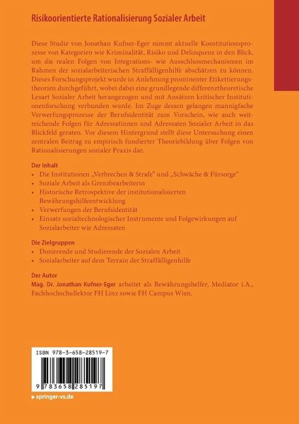 Diese Studie von Jonathan Kufner-Eger nimmt aktuelle Konstitutionsprozesse von Kategorien wie Kriminalität, Risiko und Delinquenz in den Blick, um die realen Folgen von Integrations- wie Ausschlussmechanismen im Rahmen der sozialarbeiterischen Straffälligenhilfe abschätzen zu können. Dieses Forschungsprojekt wurde in Anlehnung prominenter Etikettierungstheorien durchgeführt, wobei dabei eine grundlegende differenztheoretische Lesart Sozialer Arbeit herangezogen und mit Ansätzen kritischer Institutionenforschung verbunden wurde. Im Zuge dessen gelangen mannigfache Verwerfungsprozesse der Berufsidentität zum Vorschein, wie auch weitreichende Folgen für Adressatinnen und Adressaten Sozialer Arbeit in das Blickfeld geraten. Vor diesem Hintergrund stellt diese Untersuchung einen zentralen Beitrag zu empirisch fundierter Theoriebildung über Folgen von Rationalisierungen sozialer Praxis dar.