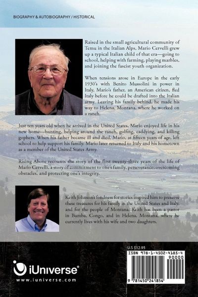 Raised in the small agricultural community of Temu in the Italian Alps, Mario Cervelli grew up a typical Italian child of that era-going to school, helping with farming, playing marbles, and joining the fascist youth organization. When tensions arose in Europe in the early 1930's with Benito Mussolini in power in Italy, Mario's father, an American citizen, fled Italy before he could be drafted into the Italian army. Leaving his family behind, he made his way to Helena, Montana, where he worked on a ranch. Just ten years old when he arrived in the United States, Mario enjoyed life in his new home-hunting, helping around the ranch, golfing, caddying, and killing gophers. When his father became ill and died, Mario, at fifteen years of age, left school to help support his family. Mario later returned to Italy and his hometown as a member of the United States Army. Rising Above recounts the story of the first twenty-three years of the life of Mario Cervelli, a story of commitment to one's family, perseverance, overcoming obstacles, and protecting one's integrity.