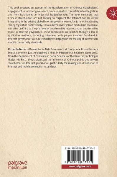 This book provides an account of the transformation of Chinese stakeholders' engagement in Internet governance, from normative contestation to integration, and from isolation to an industrial leadership role. The book concludes that Chinese stakeholders are not seeking to fragment the Internet but are rather integrating in the existing global Internet governance mechanisms while adopting strong regulation domestically. This counters a widespread media (and academic) narrative on China as the promoter of an alternative Internet and/or an alternative model of Internet governance. These conclusions are reached through a mix of qualitative methods, including interviews with people involved first-hand in Internet governance, such as technologists engaged in the making of Internet and mobile connectivity standards.