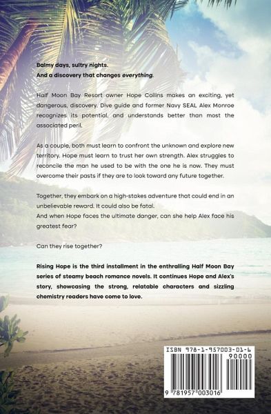 Hope Collins makes an exciting yet dangerous discovery, while Alex Monroe tries to blend past and present. Will facing their fears lead to reward or ruin? Half Moon Bay Resort owner Hope uncovers an incredible opportunity. Dive guide and former Navy SEAL Alex recognizes its potential and understands better than most the associated peril. They must overcome their pasts if they are to look toward any future together. As a couple, both must learn to confront the unknown and explore new territory. Hope has proven her success with the resort and must learn to trust her own strength. Alex struggles to reconcile the man he used to be with the one he is now. Together they embark on a high-stakes adventure that could end in an unbelievable prize. It could also be fatal. And when Hope faces the ultimate danger, can she help Alex to face his greatest fear? Can they rise together? Rising Hope is the third installment in the uplifting Half Moon Bay series of sensual contemporary romance novels. It showcases the compelling, realistic characters and irresistible setting readers have come to love!