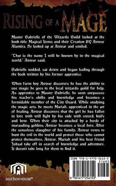 Master Gabrielle of the Wizards Guild looked at the book title: Magical Items and their Creation BY Anwar Alamira. He looked up at Anwar and smiled. "That is the name I will be known by in the magical world," Anwar said. Gabrielle nodded, sat down and began leafing through the book written by his former apprentice. When farm boy Anwar discovers he has the ability to use magic he goes to the local wizards guild for help. As apprentice to Master Gabrielle, he soon surpasses his teacher's skills and knowledge and becomes a formidable member of the City Guard. While studying the magic arts, he meets Mariah, apprenticed in the art of healing. Anwar discovers that the girl he has fallen in love with will fight by his side with sword, knife and bow. When their city is attacked by a horde of marauding goblins, Anwar becomes a local hero. After the senseless slaughter of his family, Anwar vows to hunt the evil in the world and protect those who cannot protect themselves. Anwar, Mariah and his best friend Jabaal take off in search of knowledge and adventure. It doesn't take long for them to find it.