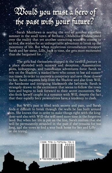 Sarah Matthews is nearing the end of another eventless summer in the small town of Bethany, Oklahoma. Disheartened over the reality that yet another unexciting season is coming to an end, she wishes for an unforgettable adventure to break up the monotony of life. But when mysterious circumstances transport Sarah and her sister, Lily, back in time, she gets more excitement than she bargained for. The girls find themselves trapped in the twelfth century in a place shrouded with mystery and deception. Assassination plots, kidnappings, and tumultuous adventures force Sarah to rely on the Shadow, a masked hero who comes to her aid numerous times. In order to uncover a conspiracy and save those closest to her, Sarah requests help from the Shadow and also from Will, the handsome and intriguing blacksmith she befriends. Sarah is strangely drawn to the excitement that seems to follow the town hero and begins to look forward to their secret encounters. She also finds herself caught in a romance with Will, despite the fact that their equally fiery personalities have a tendency to clash. But Will's past is filled with secrets and pain, and Sarah finds it difficult to break through the walls he has built around him. She knows that in order to make things right with the kingdom and also with Will she will need more time in the forgotten land. But when her life is put on the line, Sarah realizes that she will be permanently stranded in the past if she remains for too long and she vows to find a way back home for her and Lily... or die trying.