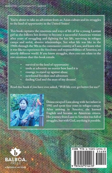 You're about to take an adventure from an Asian culture and its struggles to the land of opportunity in the United States! This book captures the emotions and ways of life of for a young Laotian girl as she follows her destiny to become a successful American woman after years of struggling and fighting for her life, surviving in refugee camps and awful, abusive relationships. See what life was like in the 1960s through the '80s in the communist country of Laos, and learn what it was like to experience the freedoms and responsibilities of America, an utterly different world. If you know struggles, then you can relate to the raw emotions that this book entails. • survival to the land of opportunity • smile at adversity no matter how hard it is • courage to stand up against abuse • newfound freedom and adventure • finding God and the man of my dreams! Read this book if you have ever asked, "Will life ever get better for me?"