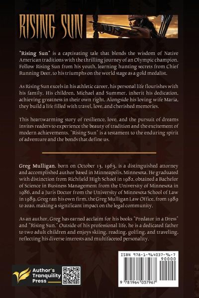 "Rising Sun" is a captivating tale that blends the wisdom of Native American traditions with the thrilling journey of an Olympic champion. Follow Rising Sun from his youth, learning hunting secrets from Chief Running Deer, to his triumphs on the world stage as a gold medalist. As Rising Sun excels in his athletic career, his personal life flourishes with his family. His children, Michael and Summer, inherit his dedication, achieving greatness in their own right. Alongside his loving wife Maria, they build a life filled with travel, love, and cherished memories. This heartwarming story of resilience, love, and the pursuit of dreams invites readers to experience the beauty of tradition and the excitement of modern achievements. "Rising Sun" is a testament to the enduring spirit of adventure and the bonds that define us.