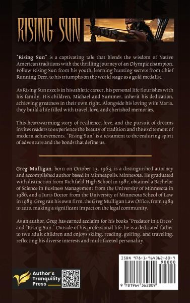 "Rising Sun" is a captivating tale that blends the wisdom of Native American traditions with the thrilling journey of an Olympic champion. Follow Rising Sun from his youth, learning hunting secrets from Chief Running Deer, to his triumphs on the world stage as a gold medalist. As Rising Sun excels in his athletic career, his personal life flourishes with his family. His children, Michael and Summer, inherit his dedication, achieving greatness in their own right. Alongside his loving wife Maria, they build a life filled with travel, love, and cherished memories. This heartwarming story of resilience, love, and the pursuit of dreams invites readers to experience the beauty of tradition and the excitement of modern achievements. "Rising Sun" is a testament to the enduring spirit of adventure and the bonds that define us.