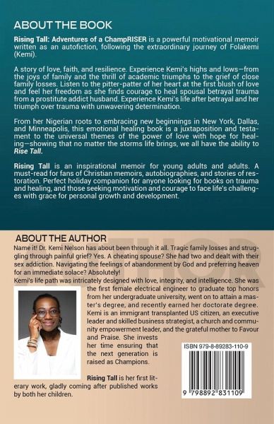 Rising Tall: Adventures of a ChampRiser is anything but a typical memoir published as an autofiction. Meet five-year-old Folakemi (Kemi) in her home country of Nigeria and experience the ultimate pleasure of eating an African star apple. Feel the love of her family as it is expressed to her in different ways. Sigh, cower, and cry as her innocence is ripped from her. Go with her on the highs as intelligence distinguishes her amidst peers and feel her lows as she struggles to find her place in the world. Triumph with the pre-adolescent Kemi, redeemed by the love of Jesus Christ. Exclaim with the teenager Kemi, as she barrels through school with distinction. Experience joy with the young adult Kemi, as she steps foot into the "oh, so American" New York City. And listen to the pitter-patter of her heart at the first blush of love. From close family losses to healing spousal betrayal trauma from a prostitute addict - and yet an excellent life of not only her own admirable feats, but of raising others to the same - this Christian memoir is a juxtaposition of life: of hurts; of deep, abiding love; of death; and of living life to the fullest purpose. From Ibadan, Nigeria to New York City, Dallas, and Minneapolis; from an unhealthy marriage to finding love again; and from having to leave behind all that is familiar to embracing the new - you will witness Kemi's highs and lows, and experience the universal themes of resilience and love, with unwavering success in the journey. You will find yourself unable to put down this story of restoration. And you will find yourself receiving full permission to "Rise Tall" no matter what storms life may send your way. Rising Tall is an uplifting memoir, presented as an autofiction novel, that chronicles the remarkable life of Folakemi. This inspirational memoir for young adults and adults highlights how faith can be your guiding light. Rising Tall is a must-read for fans and non-fans of Christian memoirs and autobiographies alike, or stories of restoration. Win Always!