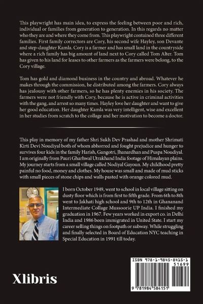 This playwright has main idea, to express the feeling between poor and rich, individual or families from generation to generation. In this regards no matter who they are and where they come from. This playwright contained three different families. First family correctors are Cory, his second wife Hayley, son Devante and step-daughter Kamla. Cory is a farmer and has small land in the countryside where a rich family has big amount of land next to Cory called Tom Alter. Tom has given to his land for leases to other farmers as the farmers were belong, to the Cory village. Tom has gold and diamond business in the country and abroad. Whatever he makes through the commission, he distributed among the farmers. Cory always has jealousy with other farmers, so he has plenty enemies in his society. The farmers were not friendly with Cory, because he is active in criminal activities with the gang, and arrest so many times. Hayley love her daughter and want to give her good education. Her daughter Kamla was very intelligent, wise and excellent in her studies from scratch to the collage and her motivation to become a doctor.