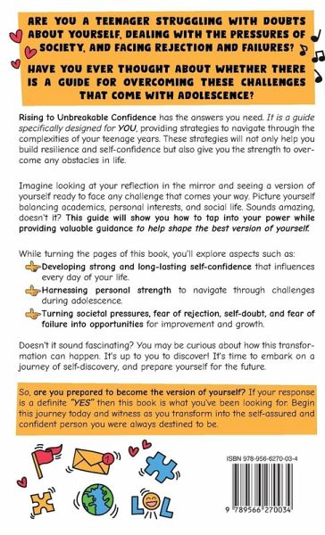 As if growing up in today's world wasn't hard enough, it's even harder when you do it with insecurities. So, give yourself the tools to conquer the challenges of adolescence, unlock a life of confident success, and step into your best self! Are you a teenager facing a maze of self-doubt and societal pressures? Do you struggle with self-esteem and constantly give into peer pressure and expectations? During these pivotal years, societal expectations, peer pressure, and personal doubts can shake even the strongest spirit. But a life where you brim with unbreakable confidence as you fearlessly navigate the complexities of youth is within reach! "Rising to Unbreakable Confidence" is a transformative guide that empowers teenagers like you to thrive, regardless of your background or challenges. Through a blend of actionable strategies, practical exercises,and relatable stories, this book equips you with a proven roadmap to self-confidence. From embracing authenticity as a foundation for self-esteem, reminding you that real confidence emerges from finding your true self and inner strength, to mindfulness and emotional intelligence, empowering you to manage perceptions and emotions effectively, and more! By reading these pages you will:Unleash Authenticity: Dive into the powerful relationship between authenticity and self-esteem. Begin to embrace your true self, cultivating a rock-solid foundation for lasting confidence in every aspect of your life. Sustain Unyielding Self-Confidence: Start building not just fleeting confidence but confidence that lasts. Uncover strategies to sustain your self-assuredness over time, from your teenage years as you navigate adolescence to adulthood as you explore the world. Align with Your Self-Purpose: Imagine yourself aligning your personal values with your life's purpose. This alignment becomes the fuel for heightened fulfillment, self-worth, and an unwavering sense of direction whichever way path you choose in life. Overcome Peer Pressure: Equip yourself with a deep understanding of the psychological intricacies of peer pressure. Through practical techniques, you'll gain the wisdom and resilience to navigate peer expectations while staying true to yourself. Master Mindfulness and Emotional Intelligence (EQ): In a world bustling with distractions, learn to master mindfulness and EQ. These invaluable tools will empower you to manage perceptions, emotions, and relationships with skill and grace. Embody Undeniable Assertiveness: The power of assertiveness cannot be underestimated. You will gain the tools to confidently express your needs, advocate for yourself, and thrive in academic, social, and professional spheres. Build Your Tailored Self-Confidence Plan: Your growth doesn't stop at the last page! Use the insights you learn after reading this book to craft a personalized action plan for ongoing self-confidence and resilience, tailored to your unique journey for years to come. And so much more! Give yourself the tools to boldly express your true self, navigate relationships with ease, and step into adulthood with unshakable self-belief. This begins a transformative journey, strengthened by expert insights and a structured, practical approach. Each chapter is a gateway to a new level of empowerment. These benefits are not just theoretical; they are the tangible stepping stones to a more confident, resilient, and fulfilled YOU who is ready to take on any challenge life throws your way.