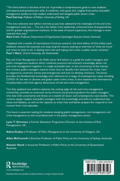 Risk and Crisis Management in the Public Sector 3rd edition is a guide for public managers and public management students which combines practical and scholarly knowledge about risk and crisis management together in a single accessible text. In the uncertainty of the twenty-first century, public managers need to know how to identify risks and plan for crises, how to respond to uncertain events and emergencies and how to develop resilience. This book provides this fundamental knowledge with reference to a range of contemporary cases including COVID-19, the war in Ukraine and global cyber-crime crises. It also explores the international, transboundary and multi-agency dimensions of risk and crisis management.