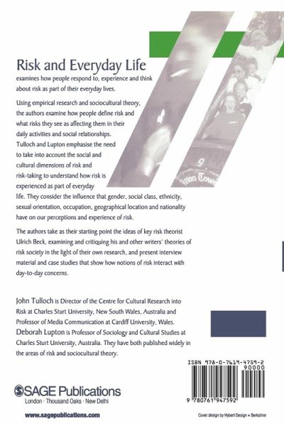 Bringing together original empirical research and sociocultural theory, the authors examine how people define risk and what risks they see as affecting them, for example in relation to immigration, employment and family life. They emphasise the need to take account of the cultural dimensions of risk and risk-taking to understand how risk is experienced as part of everyday life and consider the influence that gender, social class, ethnicity, sexual orientation, occupation, geographical location and nationality have on our perceptions and experience of risk.
