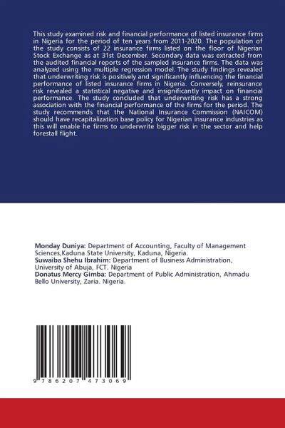 This study examined risk and financial performance of listed insurance firms in Nigeria for the period of ten years from 2011-2020. The population of the study consists of 22 insurance firms listed on the floor of Nigerian Stock Exchange as at 31st December. Secondary data was extracted from the audited financial reports of the sampled insurance firms. The data was analyzed using the multiple regression model. The study findings revealed that underwriting risk is positively and significantly influencing the financial performance of listed insurance firms in Nigeria. Conversely, reinsurance risk revealed a statistical negative and insignificantly impact on financial performance. The study concluded that underwriting risk has a strong association with the financial performance of the firms for the period. The study recommends that the National Insurance Commission (NAICOM) should have recapitalization base policy for Nigerian insurance industries as this will enable he firms to underwrite bigger risk in the sector and help forestall flight.