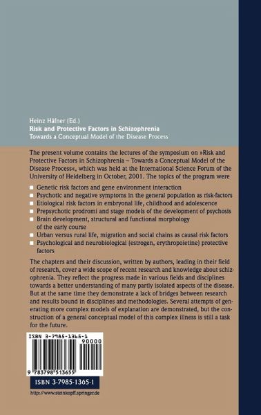 The present volume contains the lectures of the symposium on "Risk and Protective Factors in Schizophrenia - towards a conceptual Model of the Disease Process", which was held at the International Science Forum of the University of Heidelberg on October, 2001. The topics of the program were "Genetic risk factors and gene environment interaction", "Psychotic and negative symptoms in the general population as risk-factors", "Etiological risk factors in embryonal life, childhood and adolescence", "Prepsychotic prodromi and stage models of the development of psychosis", "Brain development, structural and functional morphology of the early course", "Urban versus rural life, migration and social chains as causal risk factors?", "Psychological and neurobiological (estrogen, erythropoietine) protective factors". The book covers a wide scope of recent research and knowledge about schizophrenia.