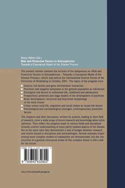 H. HAFNER Schizophrenia Research Unit, Central Institute of Mental Health, Mannheim, Germany The present volume contains the lectures and invited discussions of the sympo sium on "Risk and protective factors in schizophrenia - towards a conceptual model of the disease process", which was held at the International Science Forum of the University of Heidelberg from October 25 to 27, 200l. They are supple mented by a "Summary and outlook", in which Peter Jones gives a brief overview of the results and perspectives featured in the presentations and discussions. The contributions and discussions reflect the open-minded and creative atmosphere at the meeting. The systematically structured program of the symposium continued the tradition of the Search for the Causes of Schizophrenia symposia, which were th started in 1986 on the occasion of the 600 anniversary of the University of Hei delberg and which are co-organized with Prof. Wagner Farid Gattaz/Sao Paulo. The aim of these symposia and their proceedings volumes [6,8-10] has been to reflect the state of the art in schizophrenia research at their time, and they have successfully done so. In contrast, the present symposium pursued a more lim ited objective and was of a different type. It brought together, around a large table at the International Science Forum in Heidelberg, 22 invited speakers and dis cussants and an equal number of young scientists working in the research fields in question, who were thus given an opportunity to listen and to participate.