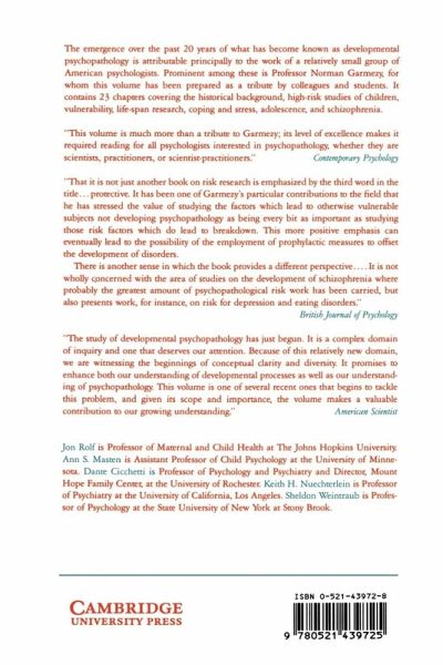 This important volume presents a definitive review of the origins and implications of developmental psychopathology and what has been learned about the phenomenon of psychosocial resilience in diverse populations at risk. Chapters by distinguished investigators in clinical psychology, psychiatry, and child development, many of whose work led to the new developmental model of psychopathology, provide a unique review of current research on vulnerability and resistance to disorder spanning from infancy to adulthood. The volume is a tribute to Professor Norman Garmezy, a pioneer in developmental psychopathology and a renowned researcher of resilience in children at risk. Highlighted throughout the volume is Professor Garmezy's theme that it is as important to understand successful outcomes as it is to study pathology in the search for better treatments and the prevention of developmental behavioural problems.