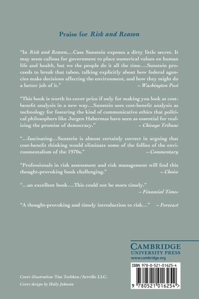 What should be done about airplane safety and terrorism, global warming, polluted water, nuclear power, and genetically engineered food? Decision-makers often respond to temporary fears, and the result is a situation of hysteria and neglect--and unnecessary illness and death. Risk and Reason explains the sources of these problems and explores what can be done about them. It shows how individual thinking and social interactions lead us in foolish directions. Offering sound proposals for social reform, it explains how a more sensible system of risk regulation, embodied in the idea of a "cost-benefit state," could save many thousands of lives and many billions of dollars too--and protect the environment in the process. Cass R. Sunstein is the Karl N. Llewellyn Distinguished Service Professor at the University of Chicago. Appointed by President Clinton to serve on the Advisory Committee on the Public Interest Obligations of Television Broadcasters. His many books include Republic.com (Princeton, 2001) and Designing Democracy (Oxford, 2001). He has worked in the United States Department of Justice and advised on law reform and constitution-making in many nations.
