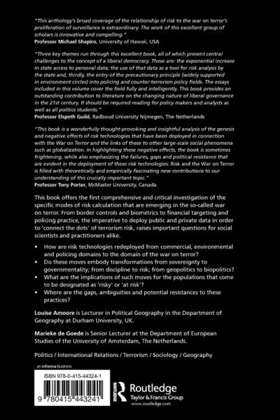 This book offers the first comprehensive and critical investigation of the specific modes of risk calculation that are emerging in the so-called War on Terror. Risk and the War on Terror offers an interdisciplinary set of contributions which debate and analyze both the empirical manifestations of risk in the War on Terror and their theoretical implications. From border controls and biometrics to financial targeting and policing practice, the imperative to deploy public and private data in order to 'connect the dots' of terrorism risk raises important questions for social scientists and practitioners alike. How are risk technologies redeployed from commercial, environmental and policing domains to the domain of the War on Terror? How can the invocation of risk in the War on Terror be understood conceptually? Do these moves embody transformations from sovereignty to governmentality; from discipline to risk; from geopolitics to biopolitics? What are the implications of such moves for the populations that come to be designated as 'risky' or 'at risk'? Where are the gaps, ambiguities and potential resistances to these practices? In contrast with previous historical moments of risk measurement, governing by risk in the War on Terror has taken on a distinctive orientation to an uncertain future. This book will be of strong interest to students and researchers of international studies, political science, geography, legal studies, criminology and sociology.