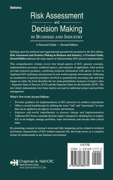 Risk Assessment and Decision-Making in Business and Industry: A Practical Guide, Second Edition addresses the many aspects of risk/uncertainty process implementation. It covers four broad aspects of R/U: general concepts; implementation processes; technical aspects; and examples of application. Each section provides practical guidance, combining technical information with advice on how to implement R/U techniques and processes in real-world corporate environments. The book describes the two main probabilistic measures of project value - Expected Value of Success (EVS) and the Expected Value for the Portfolio (EVP). The text clearly demonstrates how these metrics are used in individual-project and portfolio management.