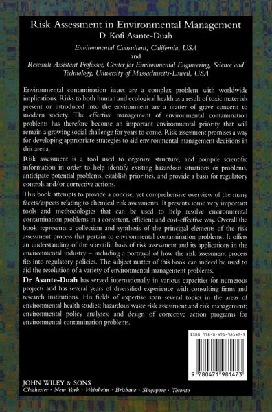 Environmental contamination issues are a complex problem with worldwide implications. Risks to both human and ecological health as a result of toxic materials present or introduced into the environment are a matter of grave concern to modern society. The effective management of environmental contamination problems has therefore become an important environmental priority that will remain a growing social challenge for years to come. Risk assessment promises a way for developing appropriate strategies to aid environmental management decisions in this arena. Risk assessment is a tool used to organize structure, and compile scientific information in order to help identify existing hazardous situations or problems, anticipate potential problems, establish priorities, and provide a basis for regulatory controls and/or corrective actions. This book attempts to provide a concise, yet comprehensive overview of the many facets/aspects relating to chemical risk assessments. It presents some very important tools and methodologies that can be used to help resolve environmental contamination problems in a consistent, efficient and cost-effective way. Overall the book represents a collection and synthesis of the principal elements of the risk assessment process that pertain to environmental contamination problems. It offers an understanding of the scientific basis of risk assessment and its applications in the environmental industry ? including a portrayal of how the risk assessment process fits into regulatory policies. The subject matter of this book can indeed be used to aid the resolution of a variety of environmental management problems.