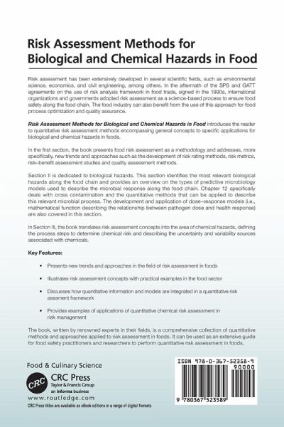 Risk Assessment Methods for Biological and Chemical Hazards in Food introduces the reader to quantitative risk assessment methods encompassing general concepts to specific applications to biological and chemical hazards in foods. In the first section, the book presents food risk assessment as methodology and addresses, more specifically, new trends and approaches such as the development of risk rating methods, risk metrics, risk-benefit assessment studies and quality assessment methods.