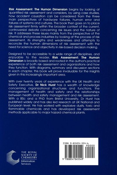 Risk Assessment: The Human Dimension begins by looking at quantified risk assessment and considers, by using case studies, how accident causation can be considered from the three main perspectives of hardware failures, human error and failures of systems and cultures. The book then goes on to place risk assessment firmly within the broader context of the current, controversial debate concerning risk issues and the nature of risk. It addresses these issues mainly from the perspective of the chemical and process industries by looking at the process of risk assessment, its strengths and weaknesses and attempts to reconcile the human dimensions of risk assessment with the need for science and objectivity in risk-based decision making. Designed to be accessible to a wide range of disciplines, and enjoyable to the reader, Risk Assessment: The Human Dimension is broadly based and rooted in the author's practical experience of both risk assessment and organizations and how they function. With diagrams, summary and discussion sections in each chapter, this book will prove invaluable for the insights given in this increasingly important area.