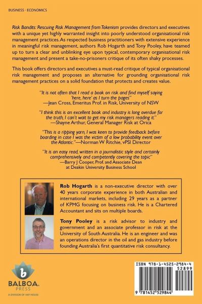 Risk Bandits: Rescuing Risk Management from Tokenism provides directors and executives with a unique yet highly warranted insight into poorly understood organisational risk management practices. As respected business practitioners with extensive experience in meaningful risk management, authors Rob Hogarth and Tony Pooley, have teamed up to turn a clear and unblinking eye upon typical, contemporary organisational risk management and present a take-no-prisoners critique of its often shaky processes. This book offers directors and executives a must-read critique of typical organizational risk management and proposes an alternative for grounding organisational risk management practices on a solid foundation that protects and creates value. "It is not often that I read a book on risk and find myself saying 'here, here' as I turn the pages"-Jean Cross, Emeritus Prof. in Risk, University of NSW "I think this is an excellent book and industry is long overdue for the truth, I can't wait to get my risk managers reading it." -Shayne Arthur, General Manager Risk at Orica "This is a ripping yarn, I was keen to provide feedback before boarding in case I was the victim of a low probability event over the Atlantic."-Norman W Ritchie, vPSI Director "It is an easy read, written in a journalistic style and certainly comprehensively and competently covering the topic" -Barry J Cooper, Prof. and Associate Dean