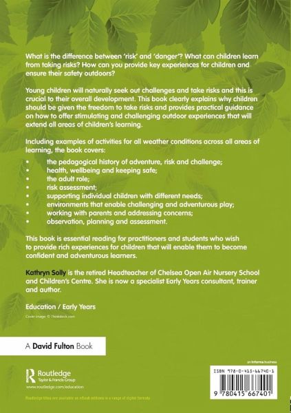 What is the difference between 'risk' and 'danger'? What can children learn from taking risks? How can you provide key experiences for children and ensure their safety outdoors? Young children will naturally seek out challenges and take risks and this is crucial to their overall development. This book clearly explains why children should be given the freedom to take risks and provides practical guidance on how to offer stimulating and challenging outdoor experiences that will extend all areas of children's learning. Including examples of activities for all weather conditions across all areas of learning, the book covers: The pedagogical history of adventure, risk and challenge Health, wellbeing and keeping safe The adult role Risk assessment Supporting individual children with different needs Environments that enable challenging and adventurous play Working with parents and addressing concerns Observation, planning and assessment This book is essential reading for practitioners and students that wish to provide rich experiences for children that will enable them to become confident and adventurous learners.