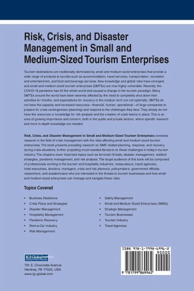 Tourism destinations are traditionally dominated by small and medium-sized enterprises that provide a wide range of products to tourists such as accommodation, travel services, transportation, recreation and entertainment, and food and beverage services. New knowledge and global risks have emerged, and small and medium-sized tourism enterprises (SMTEs) are now highly vulnerable. Recently, the COVID-19 pandemic has hit the whole world and caused a change in the tourism paradigm. Many SMTEs around the world have been severely affected by the need to completely shut down their activities for months, and expectations for recovery in the medium term are not optimistic. SMTEs do not have the capacity and increased resources-financial, human, operational-of large companies to prepare for crisis contingencies (planning) and respond to the challenges they face. They simply do not have the resources or knowledge for risk analysis and the creation of crisis teams or plans. This is an area of growing importance and concern, both in the public and private sectors, where specific research and more in-depth knowledge are needed. Risk, Crisis, and Disaster Management in Small and Medium-Sized Tourism Enterprises connects research in the field of crisis management with the risks affecting small and medium-sized tourism enterprises. The book presents prevailing research on SME-related planning, response, and recovery during crisis situations, further propelling much-needed literature on these challenges in today's tourism industry. The chapters cover important topics such as terrorism threats, disaster management, resilient strategies, pandemic management, and risk analysis. The target audience of this book will be composed of professionals working in the tourism and hospitality industries, restaurateurs, travel agencies, hotel executives, directors, managers, crisis and risk planners, policymakers, government officials, researchers, and academicians who are interested in the threats to tourism businesses and how small and medium-sized enterprises can manage and navigate these risks.
