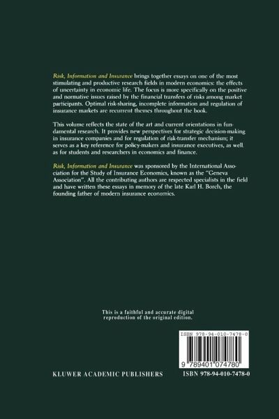 Orio Giarini The "Geneva Association" (International Association for the Study of Risk and Insurance Economics) was founded in 1973. The main goal was to stimulate and organize objective research in the field of risk, uncertainty, and insurance, in a world in which such issues were clearly becoming of greater and greater relevance for all economic actors. This was a pioneer ing effort, especially as economic theory and the teaching of economics were still anchored to the key notion of general equilibrium under an assumption of certainty. Thus, we had to start our work almost from scratch. One of the first initiatives was to bring together in Geneva, in June of 1973, all the academics in Europe already involved in risk and insurance economics. We found eight from five different countries who never had met before. This seminar chaired by Raymond Barre, the first president of The Geneva Association, was the first of an annual series that became known as the seminar of "The European Group of Risk and Insurance Economists." Since then more than 100 economists from most European countries as well as participants from two other continents and in particular from the United States have taken part in this seminar.
