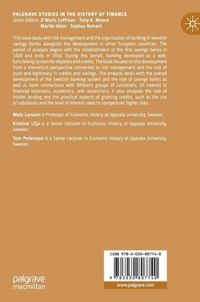 This book deals with risk management and the organisation of banking in Swedish savings banks alongside the development in other European countries. The period of analysis begins with the establishment of the first savings banks in 1820 and ends in 1910. During this period, banking developed as a well-functioning system for deposits and credits. The book focuses on this development from a theoretical perspective connected to risk management and the role of trust and legitimacy in credits and savings. The analysis deals with the overall development of the Swedish banking system and the role of savings banks as well as bank connections with different groups of customers. Of interest to financial historians, academics, and researchers, it also analyses the role of insider lending and the practical aspects of granting credits, such as the use of collaterals and the level of interest rates to compensate higher risks.