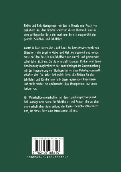 1. Risiko, Risk Management und maritime Wirtschaft - terminologische Grundlegung und Abgrenzung des Themas.- 1.1 Zum Begriff des Risikos.- 1.2. Definition und Positionierung des Risk Managements.- 1.3. Der Risikoaspekt in Schiffbau und Schiffahrt - Konzeptionelle Gesamtsicht des Themas.- 2. Risiken und Risk Management im Schiffbau.- 2.1. Die gesamtwirtschaftlichen Aspekte.- 2.2. Die einzelwirtschaftlichen Aspekte.- 2.3. Die besonderen Aspekte der ostdeutschen Werften.- 3. Risiken und Risk Management bei der Finanzierung eines Handelsschiffes.- 3.1. Die Finanzierung durch Beteiligungsgesellschaften.- 3.2. Die staatlichen Förderungsinstrumente.- 3.3. Grundlagen eines Schiffsbeteiligungsangebots.- 3.4. Chancen und Risiken für den Anleger.- 3.5. Risk Management für Schiffsbeteiligungen.- 3.6. Die Aspekte der Banken.- 4. Risiken und Risk Management in der Schiffahrt.- 4.1. Die Schiffahrt und ihr wirtschaftliches und politisches Umfeld.- 4.2. Die Reederei.- 4.3. Risiken des Seetransports.- 4.4. Die Gestaltung des Risk Management-Prozesses für die Risiken des Seetransports.- 5. Schluß.- Autorenverzeichnis.- Stichwortverzeichnis.