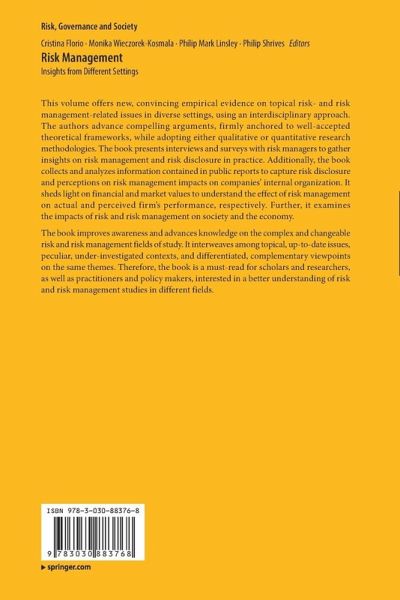The book improves awareness and advances knowledge on the complex and changeable risk and riskmanagement fields of study. It interweaves among topical, up-to-date issues, peculiar, under-investigated contexts, and differentiated, complementary viewpoints on the same themes. Therefore, the book is a must-read for scholars and researchers, as well as practitioners and policy makers, interested in a better understanding of risk and risk management studies in different fields.