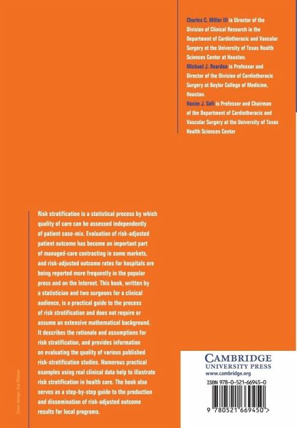 Risk stratification is a statistical process by which quality of care can be assessed independently of patient case mix. The evaluation of risk-adjusted patient outcome has become an important part of managed care contracting in some markets, and risk-adjusted outcome rates for hospitals are being reported more frequently in the popular press and on the Internet. This book, written by a statistician and two surgeons for a clinical audience, is a practical guide to the process of risk stratification and does not require or assume an extensive mathematical background. It describes the rationale and assumptions for risk stratification, and provides information on evaluating the quality of various published risk-stratification studies. Numerous practical examples using real clinical data help to illustrate risk stratification in health care. The volume also serves as a step-by-step guide to the production and dissemination of risk-adjusted outcome results for local programs.