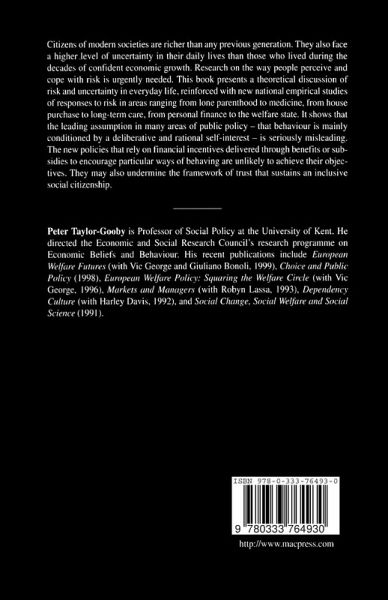 List of Tables Preface Notes on the Contributors Risk and Welfare; P.Taylor-Gooby PART I: MOTIVES, POLICY AND BEHAVIOUR From Knight to Knave: Public Policy and Endogenous Motivation; J.LeGrand Motivation and Human Behaviour; B.S.Frey Managing Risk by Controlling Behaviour: Social Security Administration and the Erosion of Welfare Citizenship; H.Dean PART II: RESPONSES TO RISK The Rationality Mistake: New Labour's Communitarianism and 'Supporting Families'; A.Barlow & S.Duncan with R.Edwards Coping with Risk in a Flexible Labour Market; J.Ford Public Understanding of Financial Risk: The Challenge to Regulation; P.Lunt & J.Blundell Insights into the Uncertain World of the Consumer: Reflections on the Risks of Non-Prescription Medicines; P.R.Ward, P.Bissell & P.R.Noyce Choices in Owner-Occupation; M.Munro Risk and the Need for Long-Term Care; G.Parker References Index