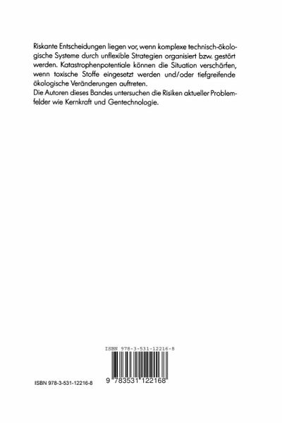 Riskante Entscheidungen liegen vor, wenn komplexe technisch-ökologische Systeme durch unflexible Strategien organisiert bzw. gestört werden. Katastrophenpotentiale können die Situation verschärfen, wenn toxische Stoffe eingesetzt werden und/oder tiefgreifende Veränderungen auftreten. Die Autoren dieses Bandes untersuchen die Risiken aktueller Problemfelder wie Kernkraft und Gentechnologie.