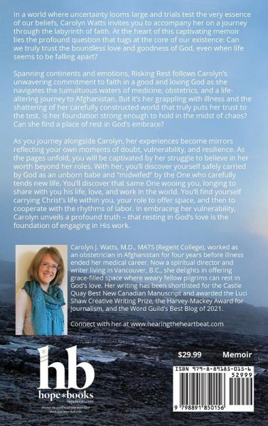 In a world where uncertainty looms large and trials test the very essence of our beliefs, Carolyn Watts invites you to accompany her on a journey through the labyrinth of faith. At the heart of this captivating memoir lies the profound question that tugs at the core of our existence: Can we truly trust the boundless love and goodness of God, even when life seems to be falling apart? Spanning continents and emotions, Risking Rest follows Carolyn's unwavering commitment to faith in a good and loving God as she navigates the tumultuous waters of medicine, obstetrics, and a life-altering journey to Afghanistan. But it's her grappling with illness and the shattering of her carefully constructed world that truly puts her trust to the test. Is her foundation strong enough to hold in the midst of chaos? Can she find a place of rest in God's embrace? As you journey alongside Carolyn, her experiences become mirrors reflecting your own moments of doubt, vulnerability, and resilience. As the pages unfold, you will be captivated by her struggle to believe in her worth beyond her roles. With her, you'll discover yourself safely carried by God as an unborn babe and "midwifed" by the One who carefully tends new life. You'll discover that same One wooing you, longing to share with you his life, love, and work in the world. You'll find yourself carrying Christ's life within you, your role to offer space, and then to cooperate with the rhythms of labor. In embracing her vulnerability, Carolyn unveils a profound truth - that resting in God's love is the foundation of engaging in His work.